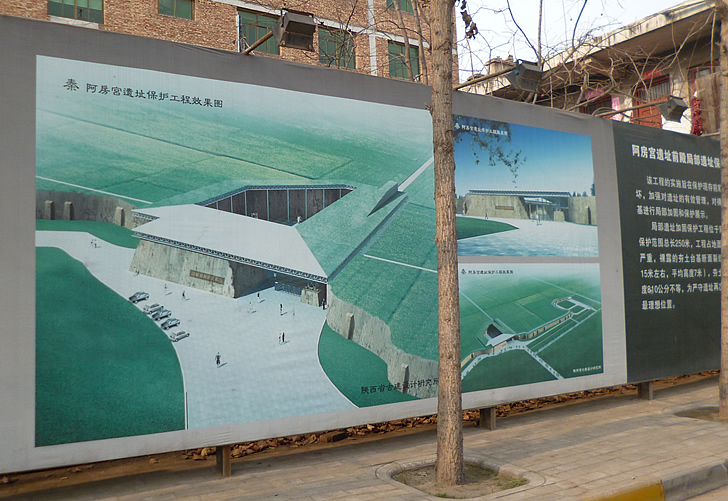走到「古渡公園」的盡頭,腿都酸了,已近晚上七點。老妻說這邊太過清冷,不如返回西安市區才找吃的。於是打道回府,草草結束這個「尋秦一天遊」。 …… 何厚此而薄彼? 自是意猶未盡,於是翌日我們還有個「尋秦半天遊」。 去哪呢? 就是比「咸陽宮」更出名的「阿房宮」(遺址)。 這「阿房宮遺址」位處西安市跟咸陽市之間的「僻偏地帶」,加之我疑心已經沒有人去,網上的交通資料要非沒有就是混亂過時。 都忘了是轉了幾次公車,才去到附近。 遺址不在大路上,加之下早了一個站,下車後還得走一大段路。 忽然看見路旁有一間《秦阿房宮遺址博物館》,大喜過望,以為不枉此行。